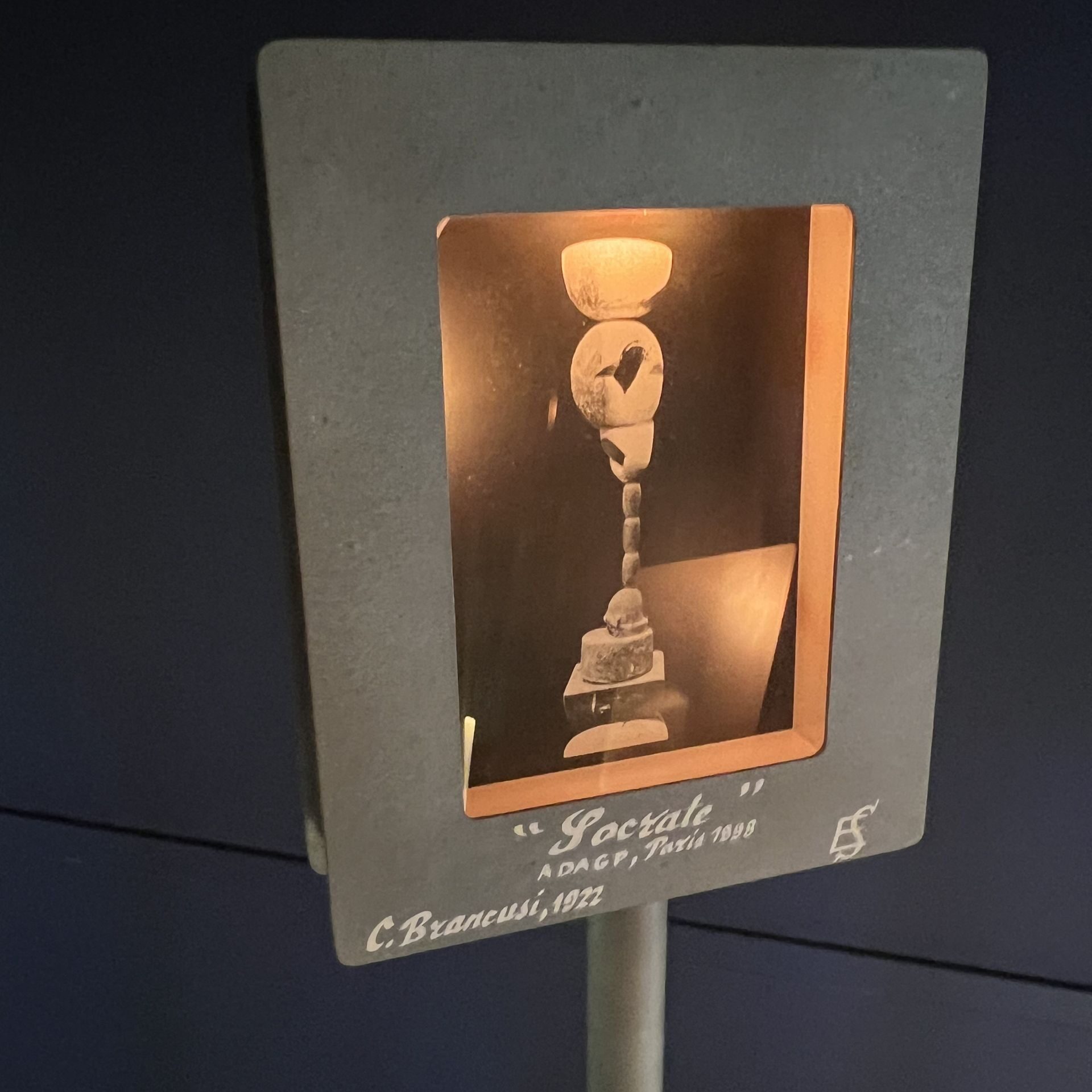 Fotografia este a celebrei sculpturi „Socrate” realizată în lemn de maestru Brâncuși, operă de artă ce se află în prezent expusă în MOMA (The Museum of Modern Art ) din New York.